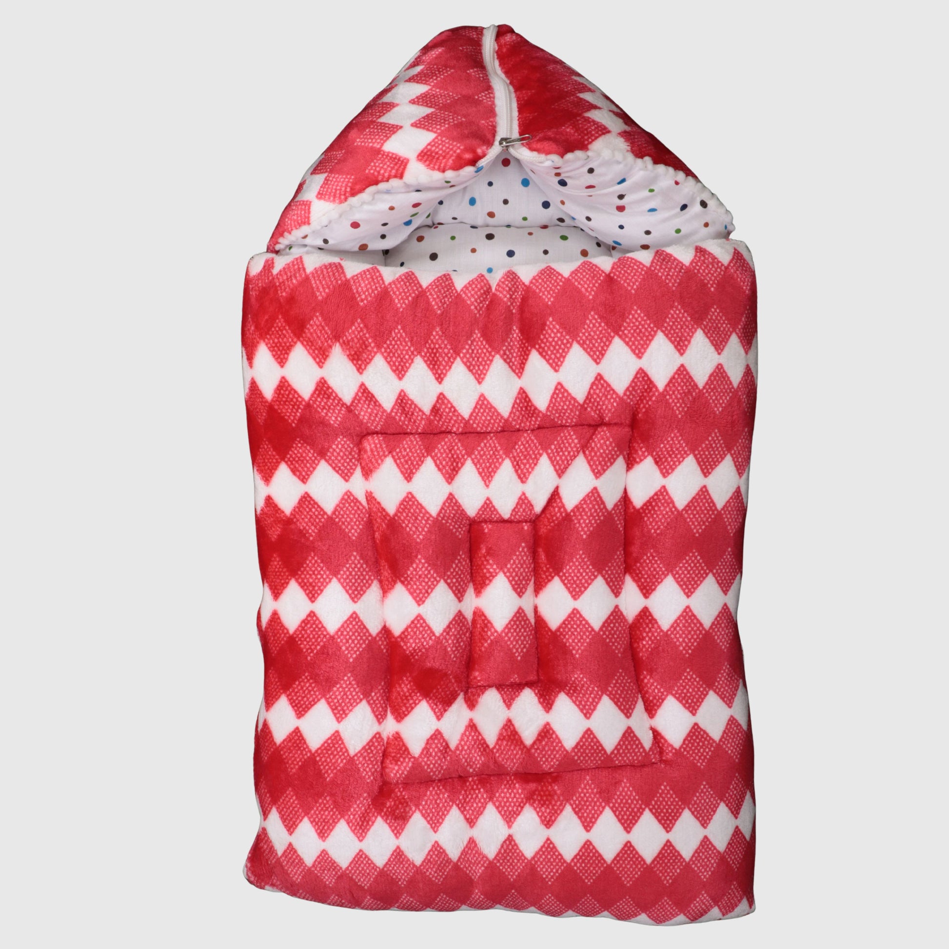 Soft and cozy baby sleeping bag with vibrant red & white diamond pattern and colorful polka-dot lining — perfect for newborns and infants.