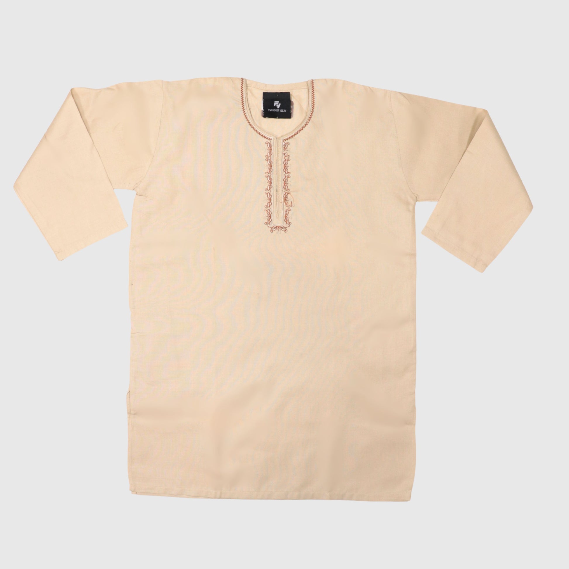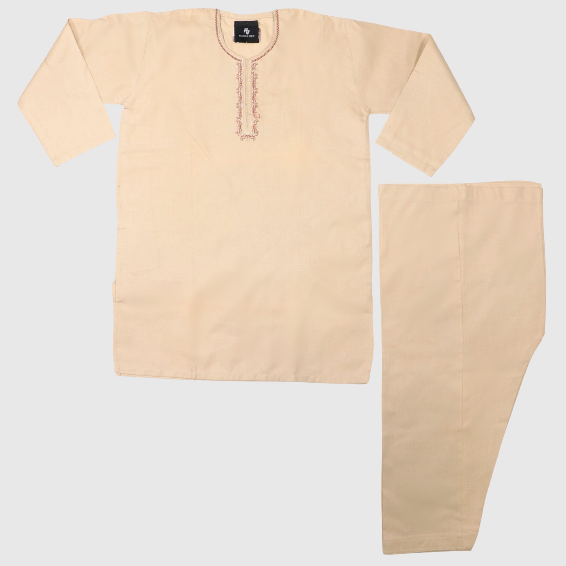 This Beige Kurta Pajama is made from soft blended fabric, providing a gentle and comfortable feel for your child. The breathable material will not irritate the skin, keeping your little one relaxed all day. The soft beige color gives a classic and elegant look, perfect for casual wear or festive occasions.