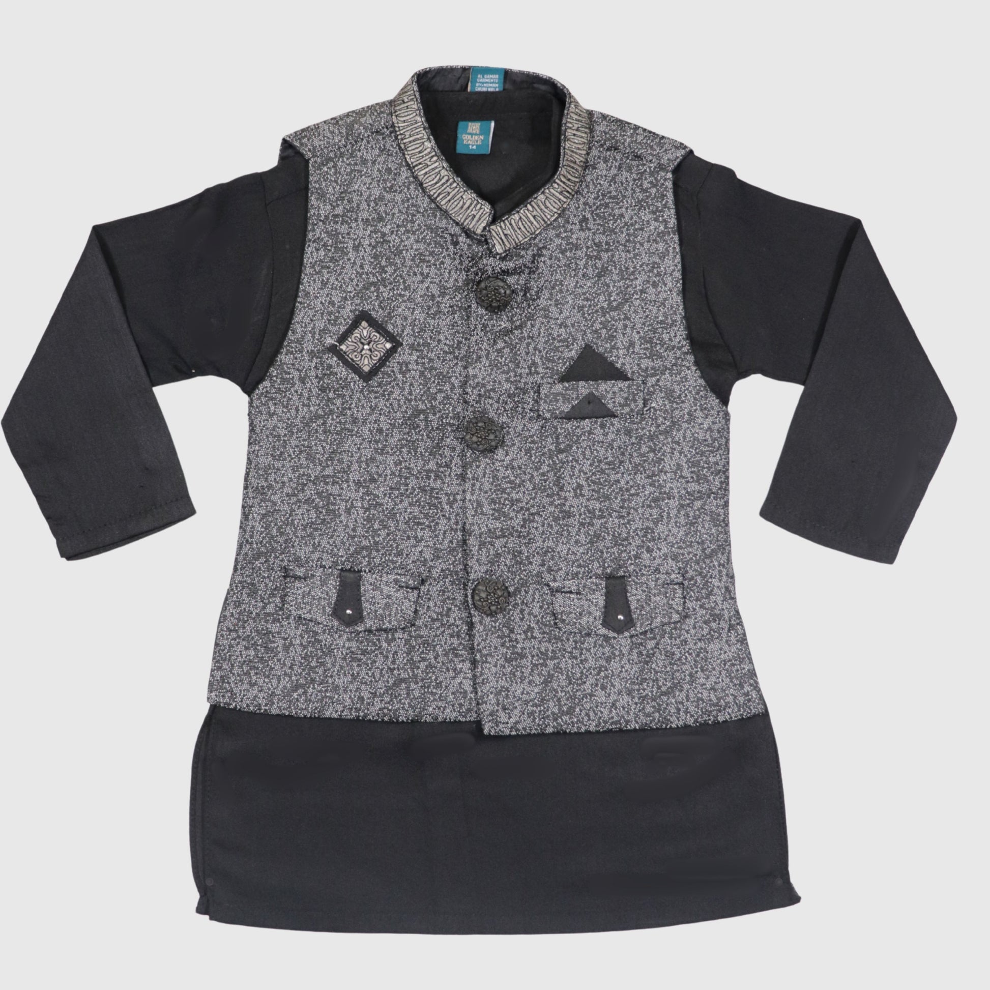 This elegant Black Kurta Pajama with Waistcoat is perfect for festive occasions, family gatherings, and special events. Made from soft blended fabric, it provides comfort while giving your child a stylish traditional look. The matching waistcoat adds a classy and complete finishing touch.