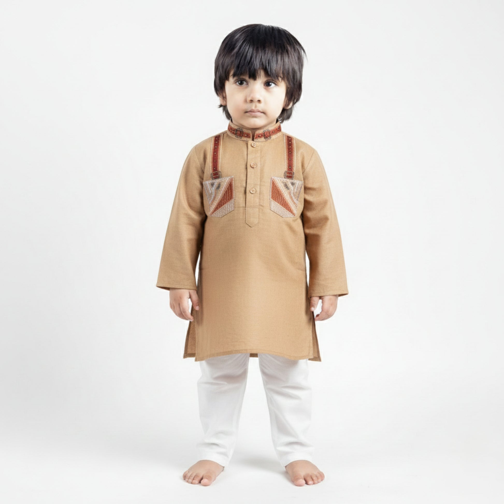 This Brown Shalwar Kameez is designed for everyday comfort and a smart traditional look. Made from soft blended fabric, it’s gentle on your child’s skin and ensures easy movement throughout the day. Perfect for festive gatherings or casual wear, this outfit blends simplicity with elegance.