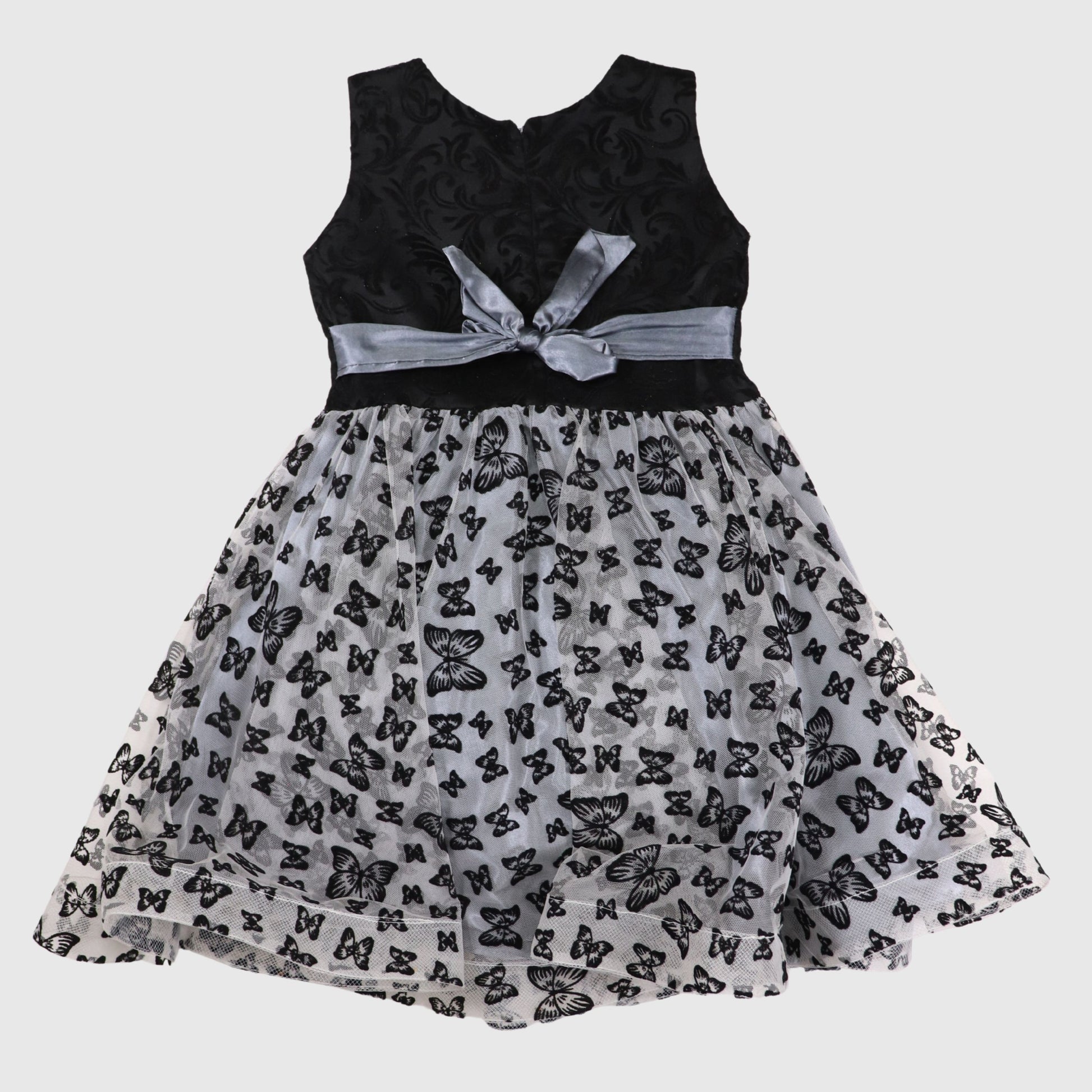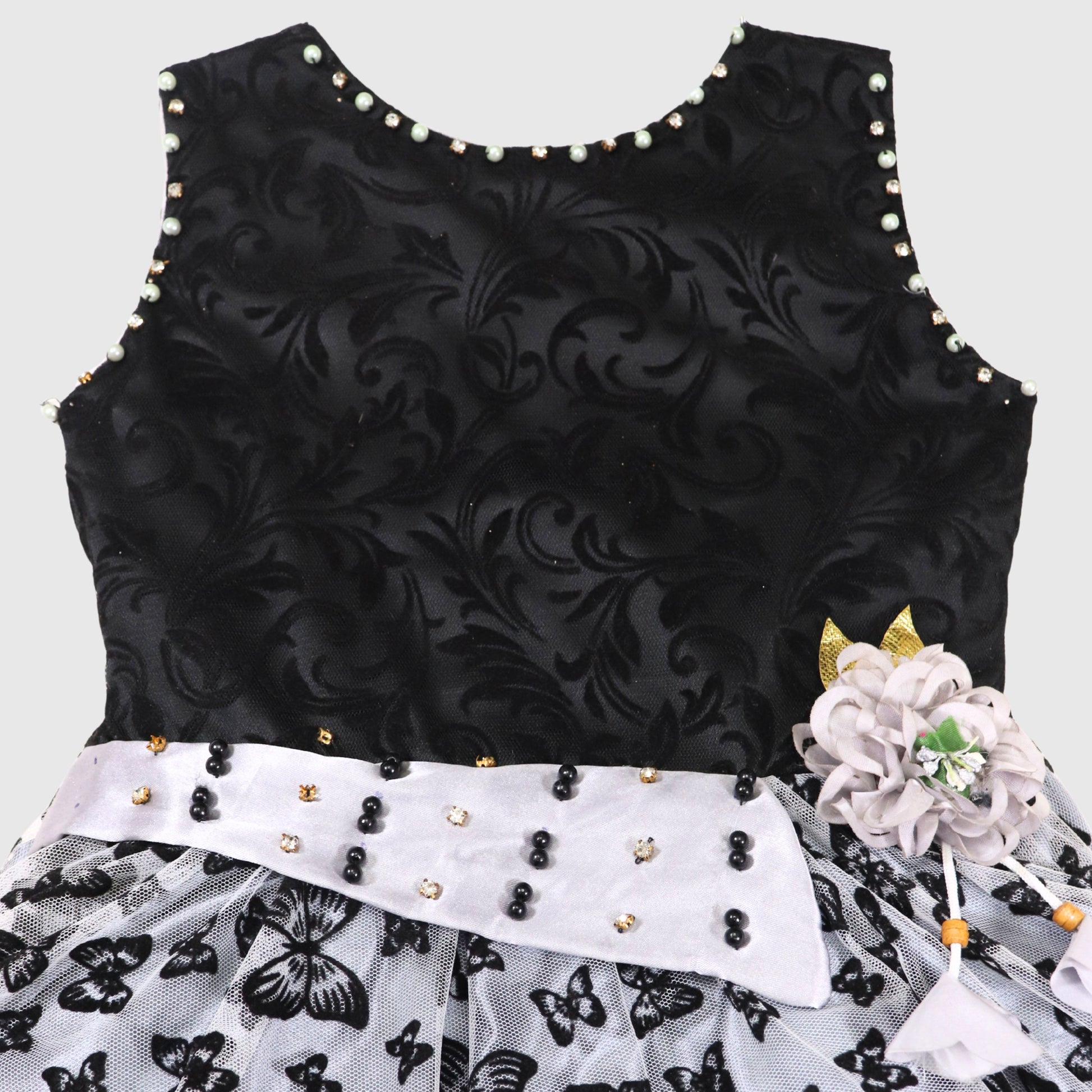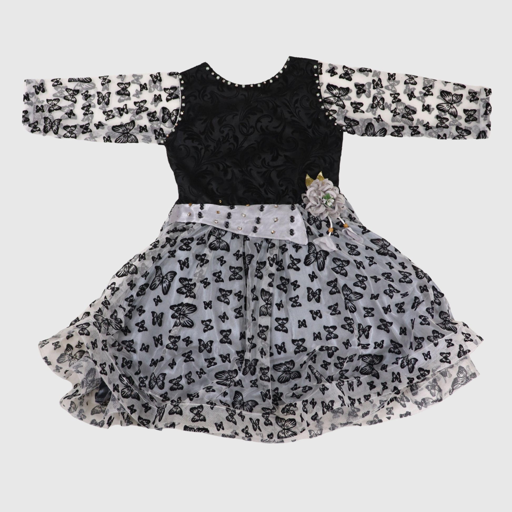 This stunning black and white butterfly frock is a perfect blend of elegance and charm. It features a soft velvet bodice adorned with pearl accents and a flared net skirt covered in beautiful butterfly prints. The floral belt adds a stylish finishing touch, making it ideal for parties and special occasions.