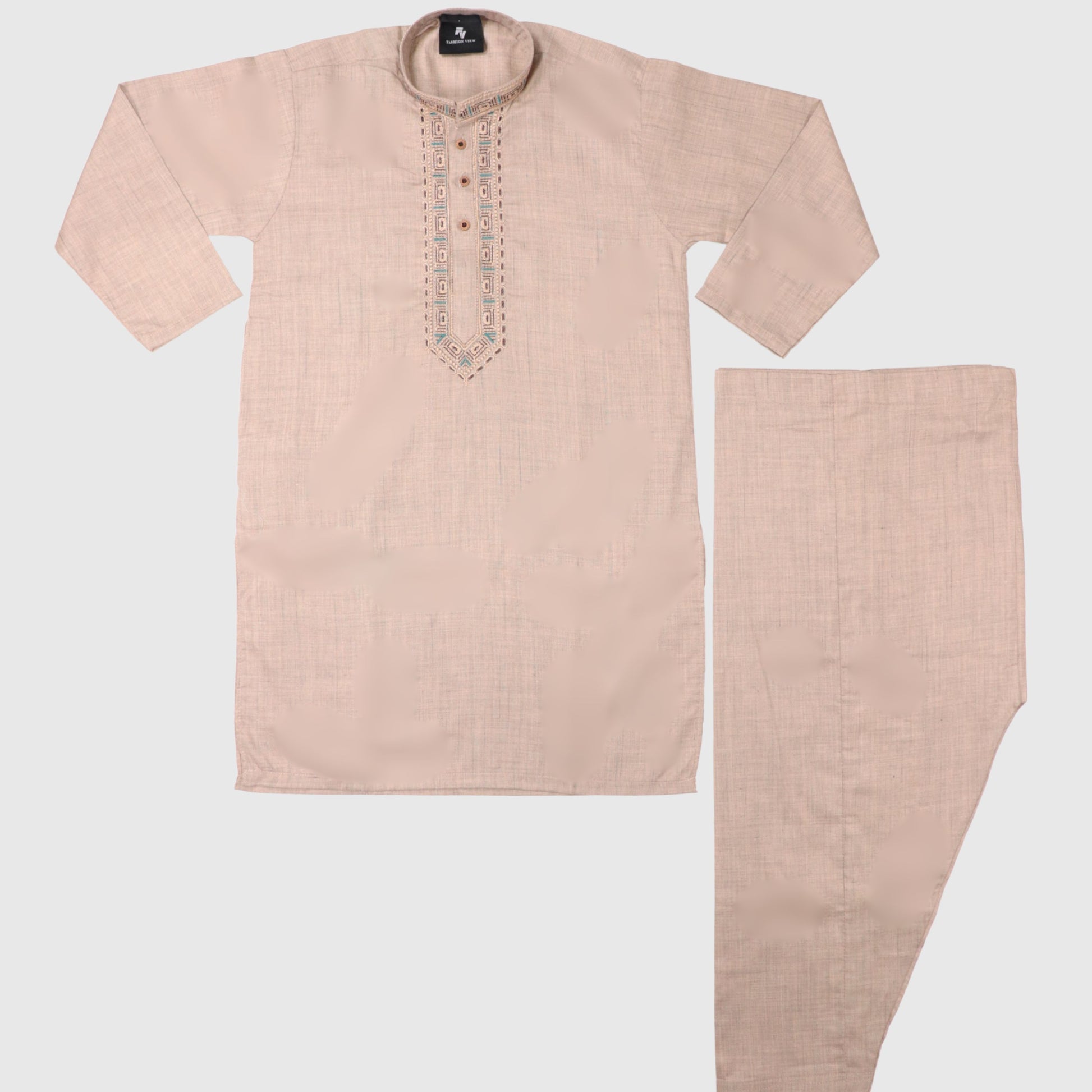 This Cream Shalwar Kameez is made from soft blended fabric, providing a gentle and comfortable feel for your child. The breathable material ensures all-day comfort without irritating the skin. The soft cream color gives a fresh and elegant look, perfect for casual outings, family gatherings, or festive occasions. Its lightweight and smooth fabric keeps your little one comfortable while looking smart and stylish.