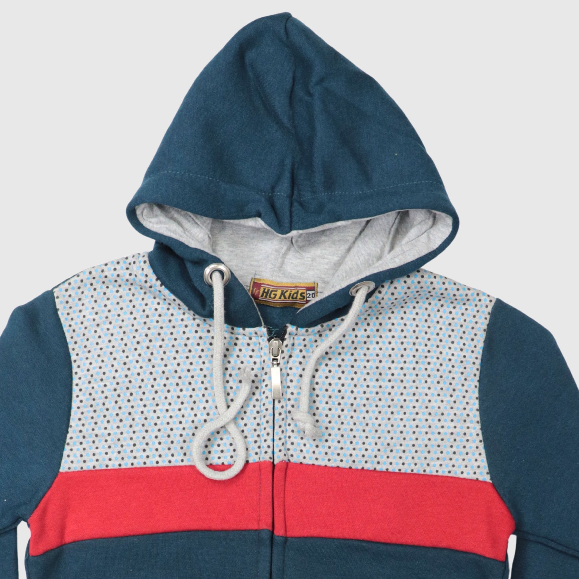 Keep your little one cozy and stylish with this Full-Zip Hooded Sweatshirt. Made from soft Fleece (or Cotton Blend), it features Dark Green and Light Grey (Heather) with a split body design. The front showcases a multi-graphic chest print, including “VOGO BOYS” and “CAMPUS” text, along with red and black striped cuffs and hem. Perfect for everyday wear, school, or playtime.