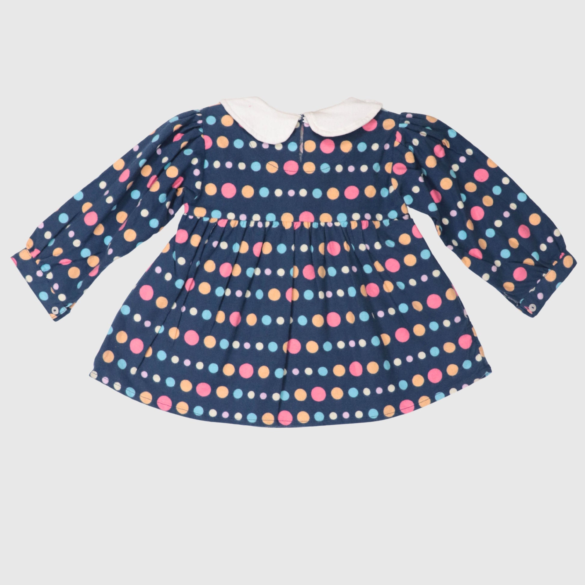 A lovely polka dot frock in soft pink and lavender tones. Designed with either a smocked chest and flower pin or a plain gathered style, it brings both comfort and style to your little one’s wardrobe.