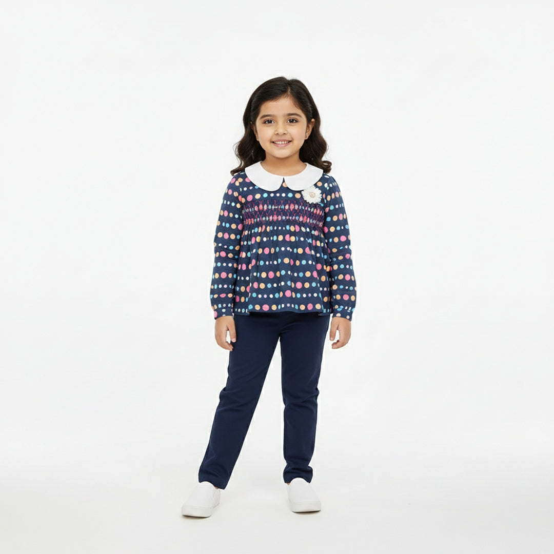 This lovely polka dot frock for girls comes in soft pink and lavender tones, offering a blend of comfort and style. Choose between a smocked chest with a flower pin or a plain gathered style. Perfect for casual outings, playdates, or special occasions, this frock adds a cute touch to your little one’s wardrobe.