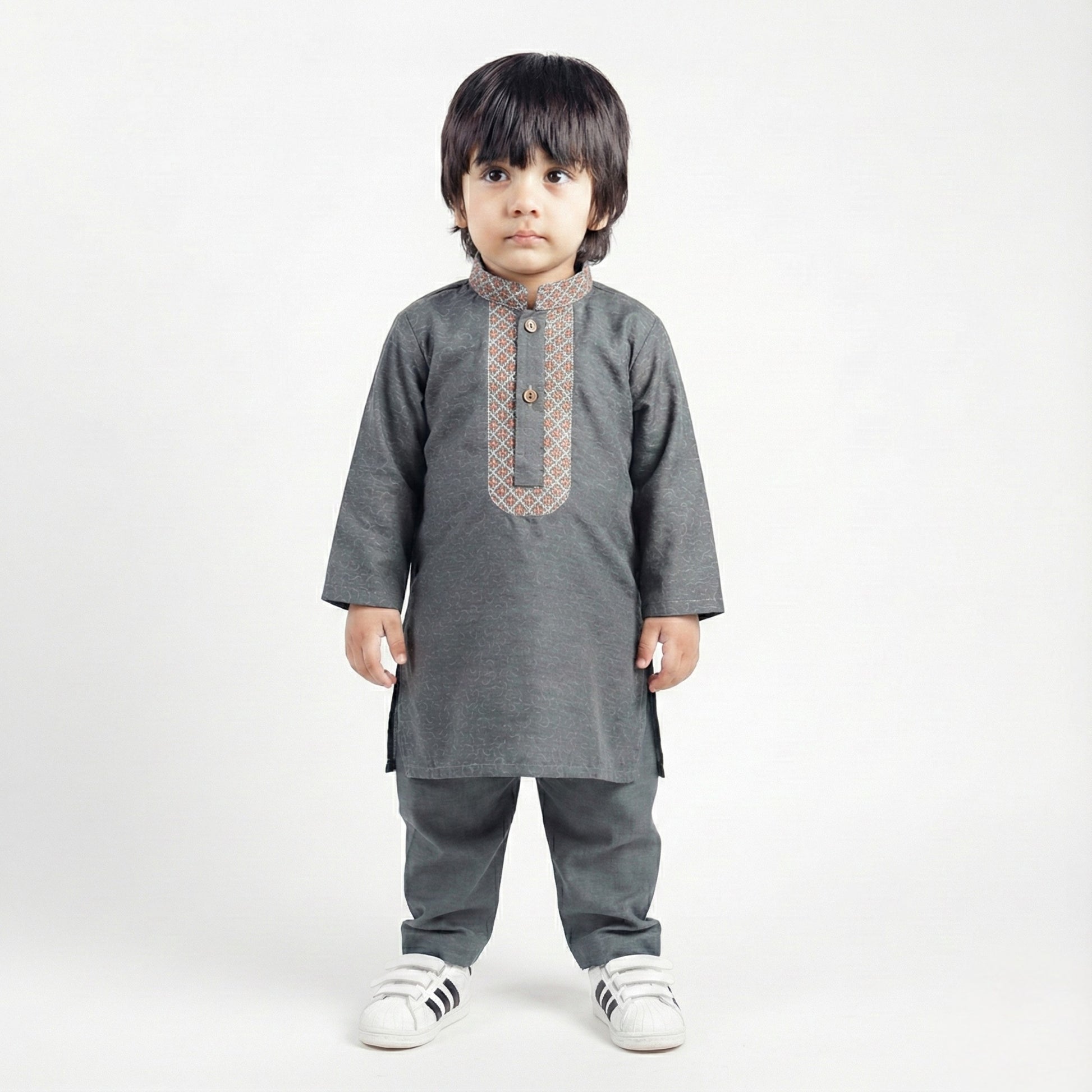 This Grey Shalwar Kameez is a perfect blend of comfort and style for your little one. Crafted from soft blended fabric, it’s gentle on the skin and ideal for all-day wear. The subtle grey tone gives a smart, modern, and elegant appearance — perfect for any occasion.