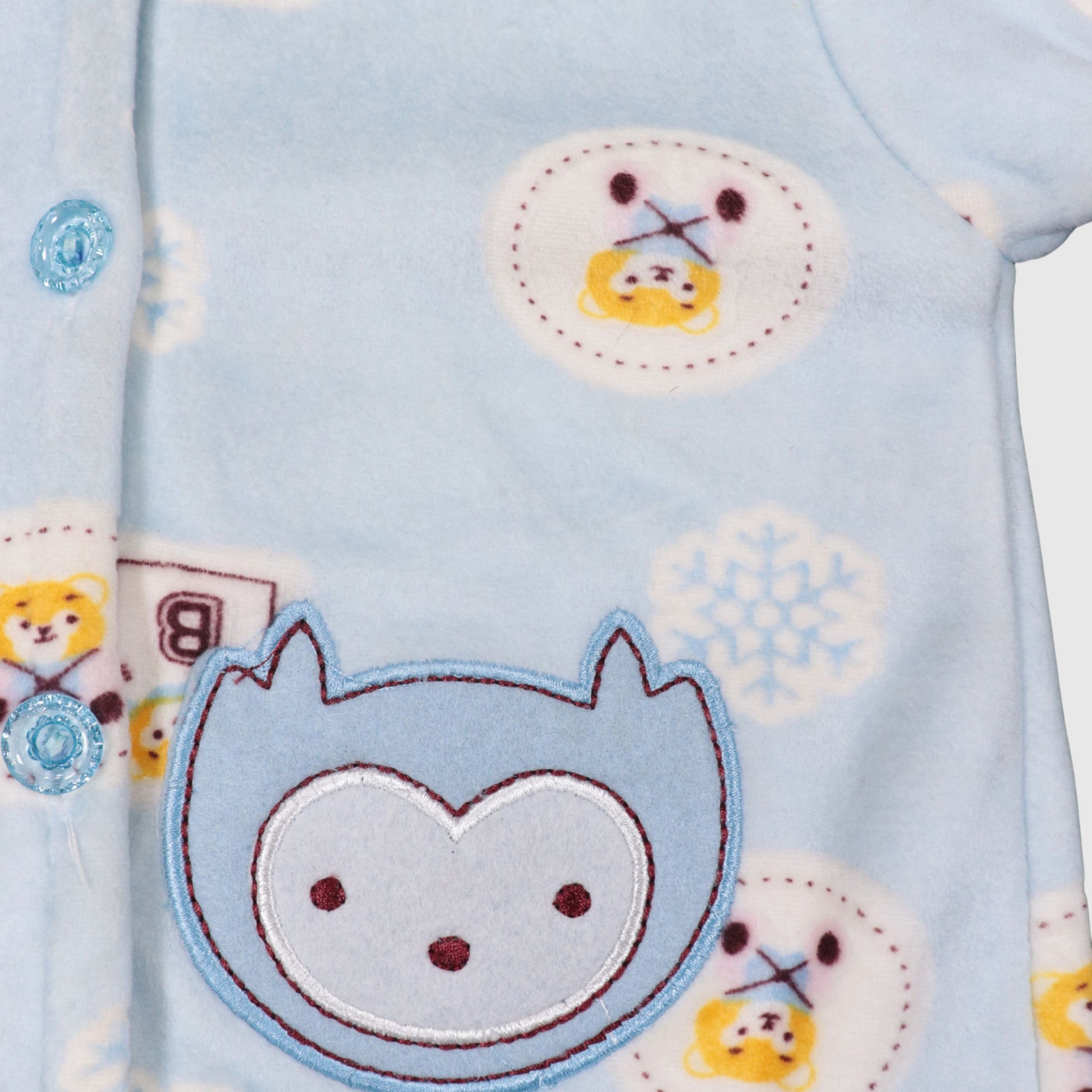 Soft and warm 2-piece baby winter suit set. Light blue top with bear & snowflake print and owl patch pockets, paired with matching trousers — perfect for keeping babies cozy.