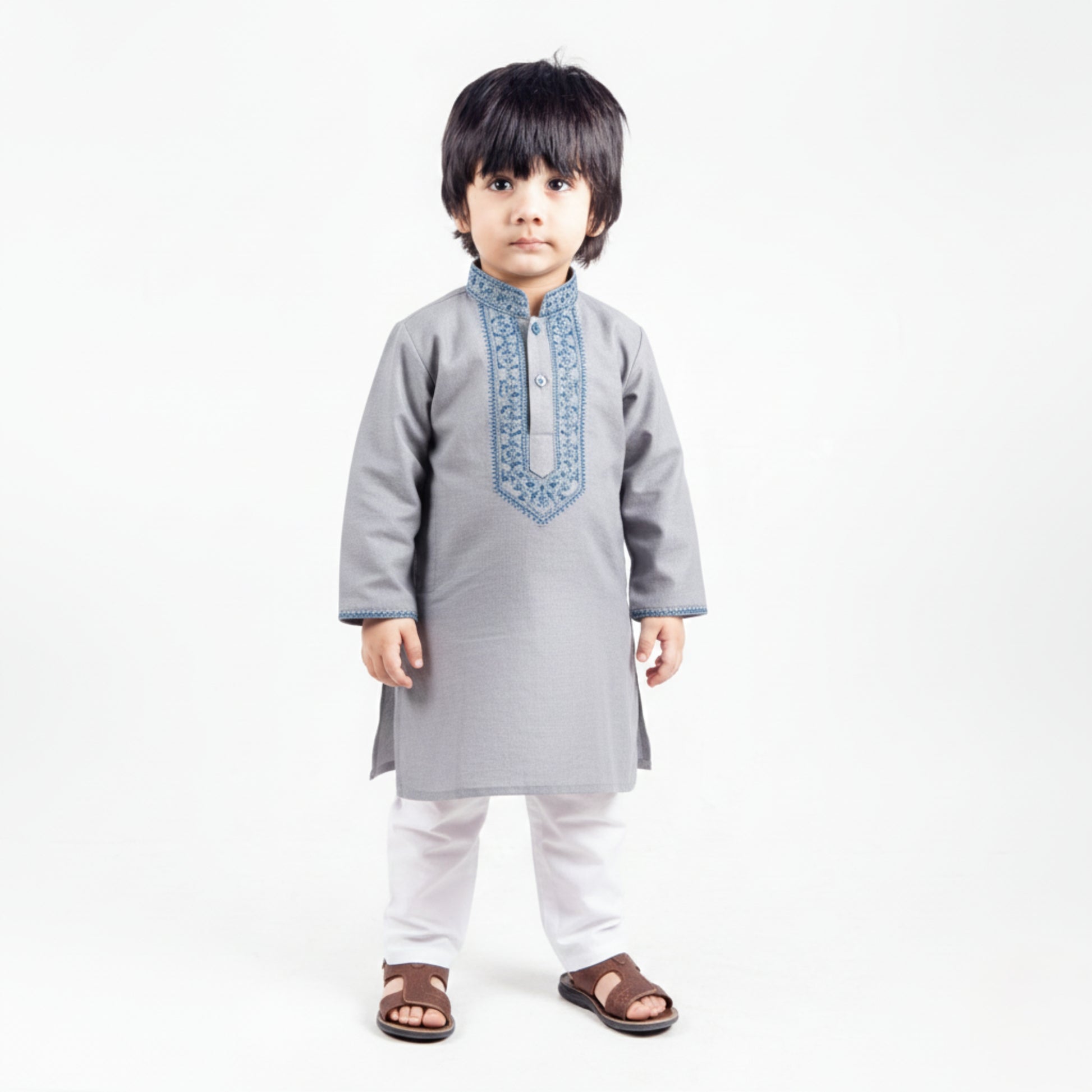 This Light Grey Kameez paired with a White Shalwar brings a graceful and refreshing look to your child’s wardrobe. Made from soft blended fabric, it ensures maximum comfort throughout the day without causing irritation. The subtle color contrast adds a touch of elegance, perfect for festive occasions or casual wear.