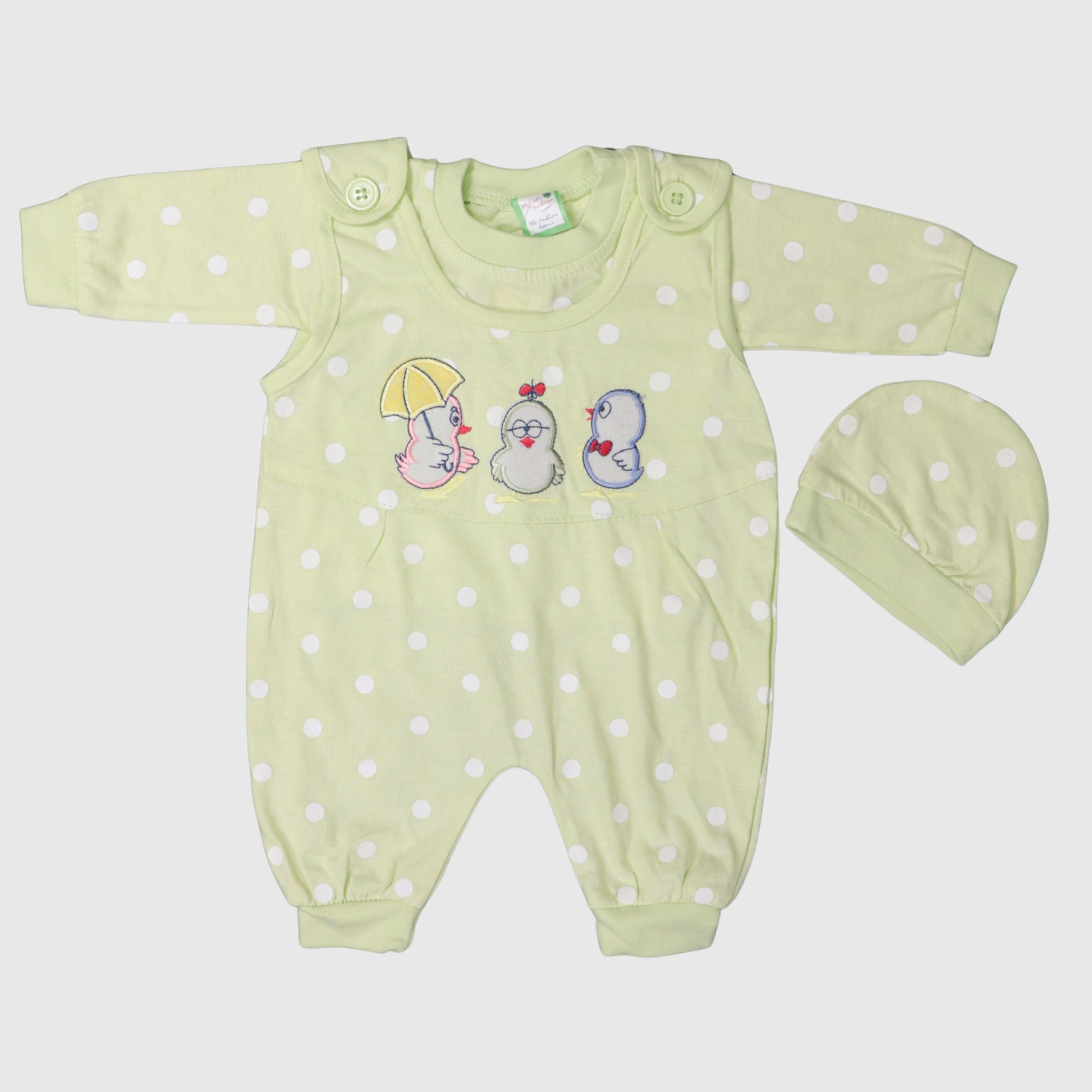 Cute 2-piece romper with matching cap. Soft cotton, snap buttons, and fun bird embroidery — perfect for everyday wear.