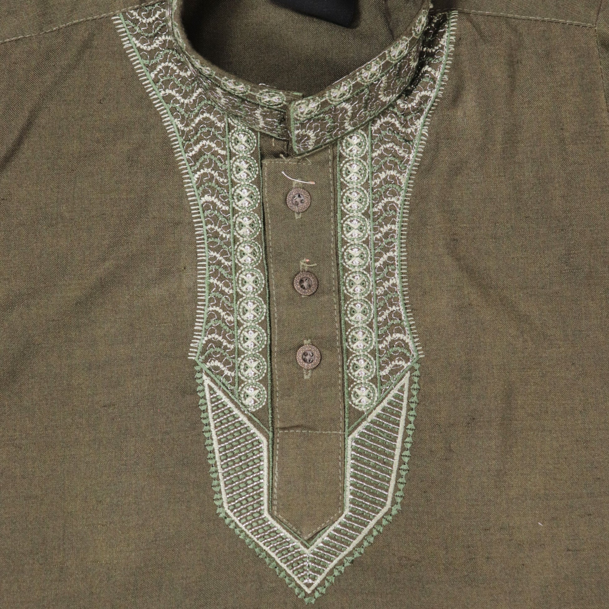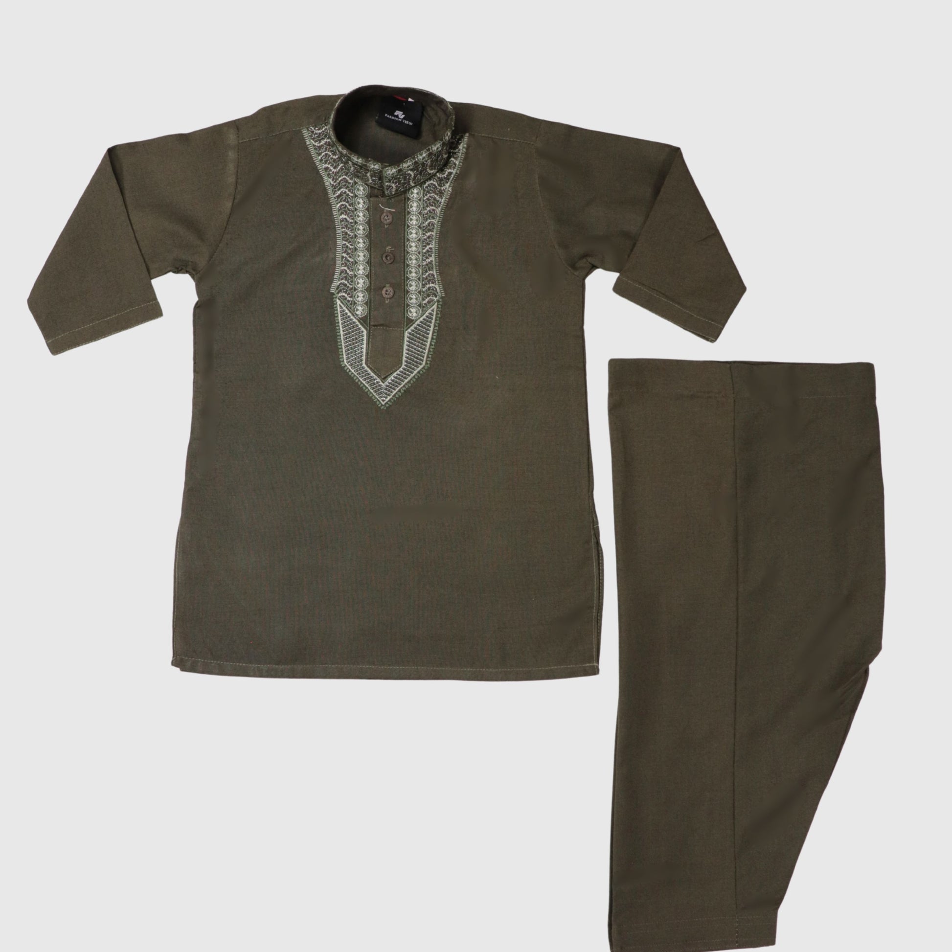 This Olive Green Shalwar Kameez offers a classic and stylish look for your little one. Made from soft blended fabric, it’s gentle on the skin and comfortable for all-day wear. Ideal for casual outings, festive occasions, or family gatherings.