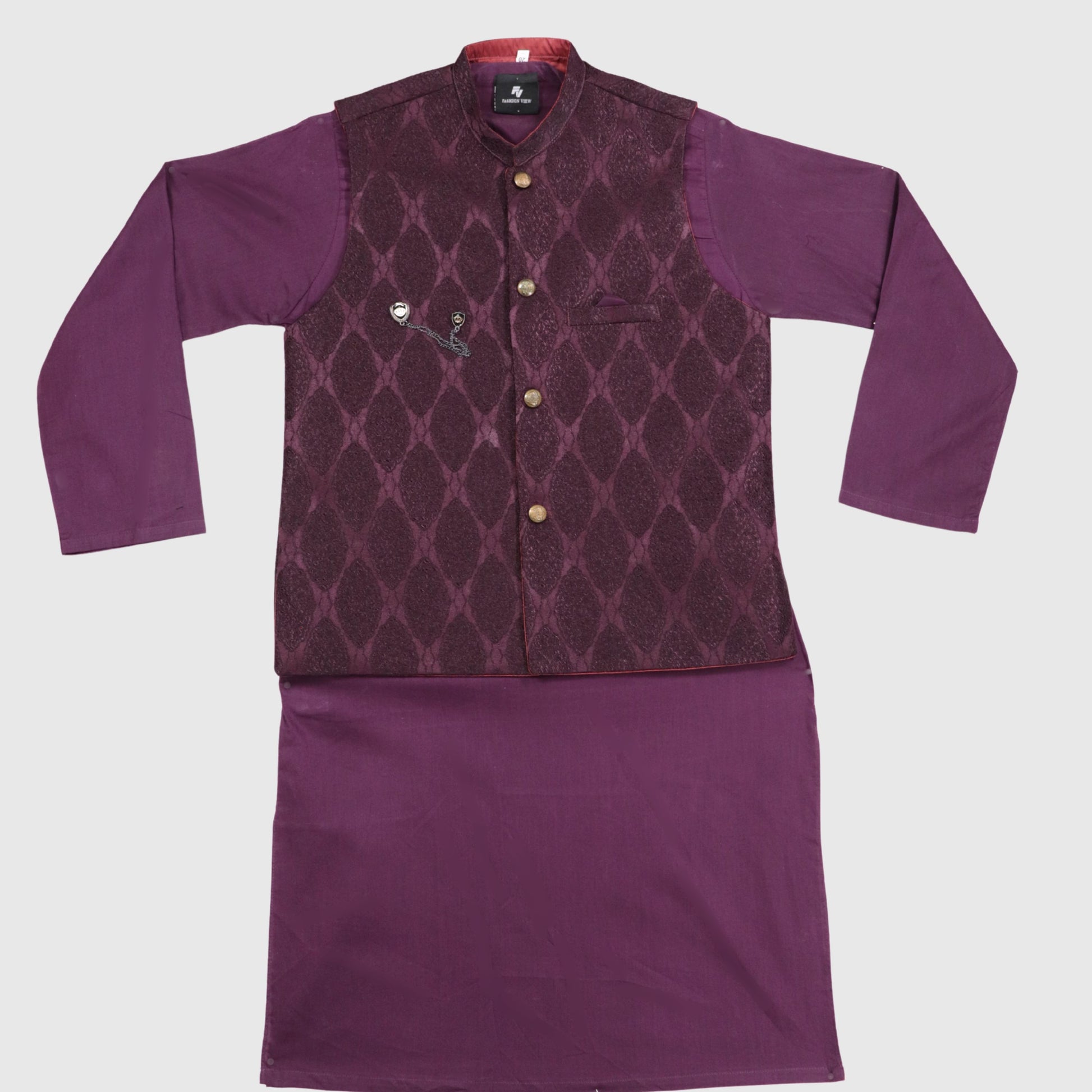 This stylish Purple Kurta Pajama with Waistcoat is perfect for weddings, festive occasions, and family gatherings. Made from soft blended fabric, it ensures comfort while giving your child a smart traditional look. The matching waistcoat adds a classy touch, making the outfit complete and elegant.