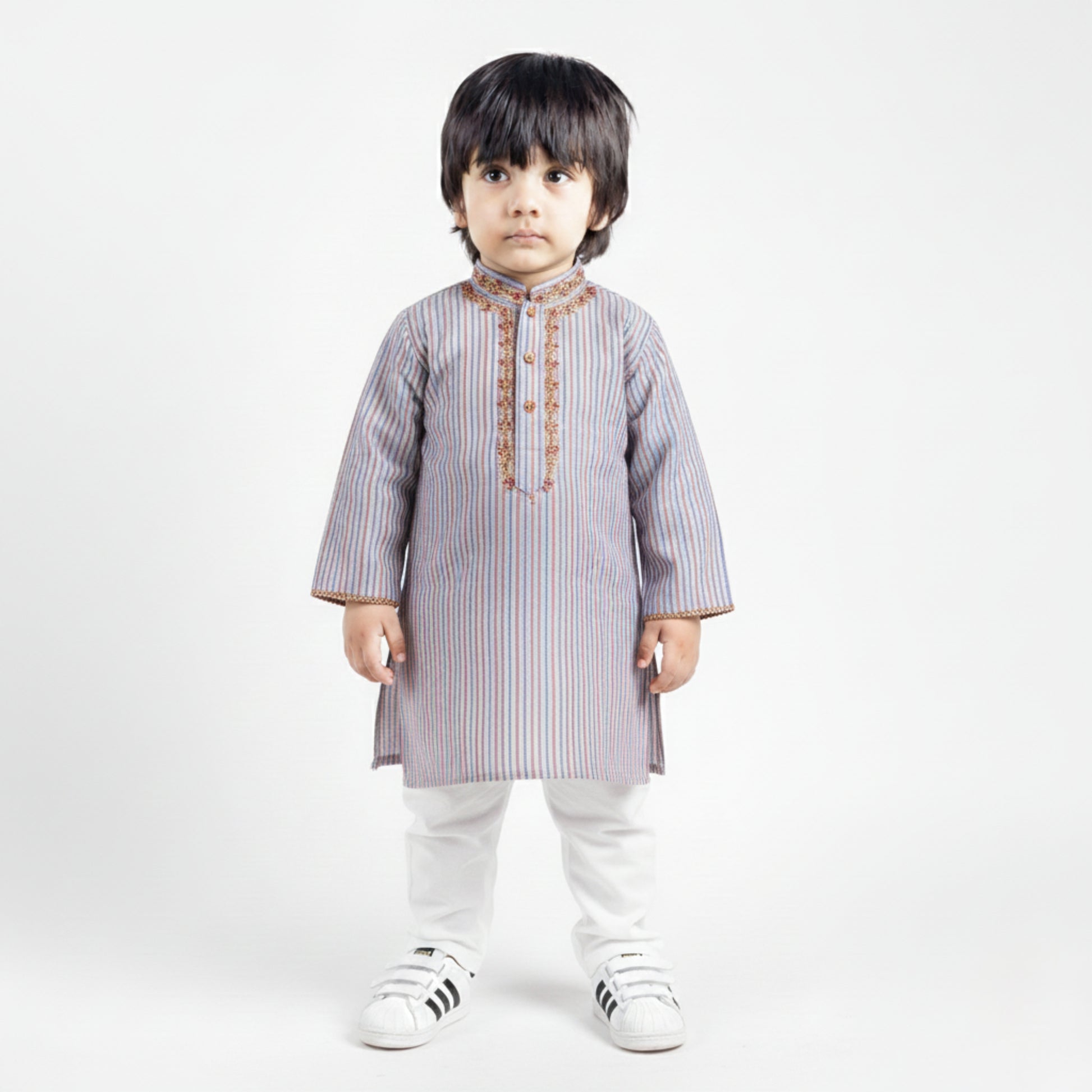 This Purple Lining Shalwar Kameez adds a stylish pop of color with subtle purple lining details. Made from soft blended fabric, it’s gentle on your little one’s skin and ensures all-day comfort. Perfect for casual outings, festive occasions, or family gatherings.