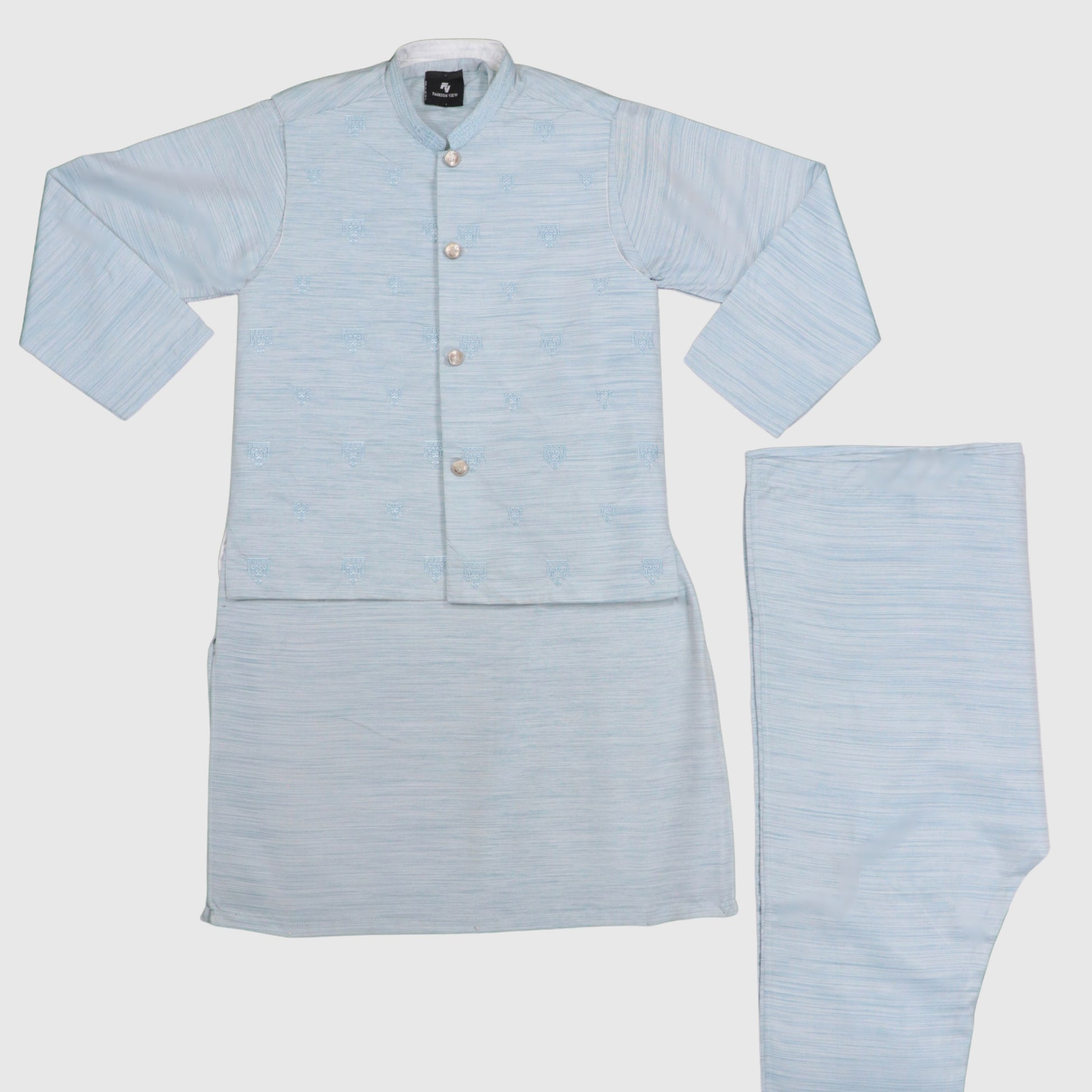 Dress your child in this Sky Blue Kurta Pajama with Matching Waistcoat. Made from soft blended fabric, it provides all-day comfort while keeping a stylish traditional look. The matching waistcoat completes the outfit, perfect for weddings, Eid celebrations, and family gatherings.