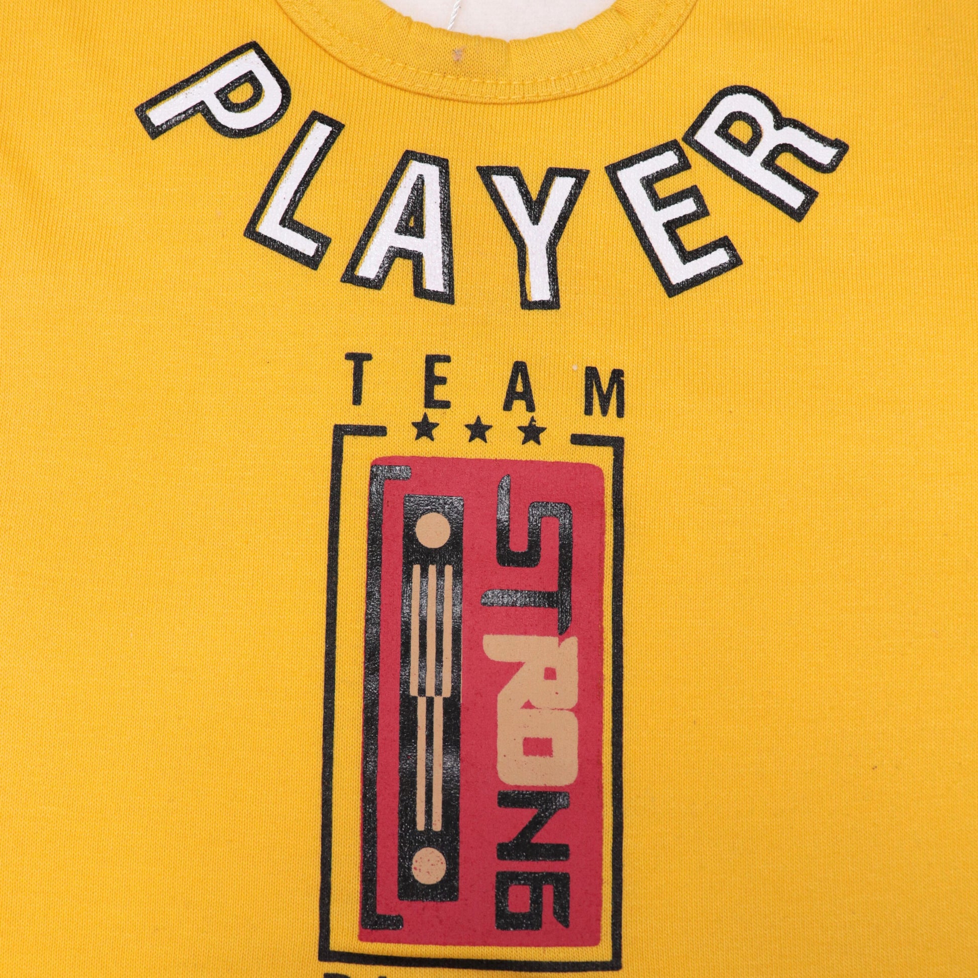 - Design: Yellow top with round neck & shoulder buttons, “PLAYER TEAM STRONG” print;tan/brown trousers with yellow cuffs